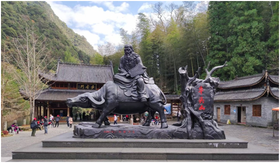 山路十八弯,车随着盘山路一路回转,突然间,雾消散了,明媚的阳光照亮了大山,我们也来到了牛头山国家森林公园的大门处。大门口两只超级大牛角在欢迎我们的到来。景区售票处至检票处竟然还有5.6公里的盘山路,我们坐着景区大巴来到检票口。检票口外有一黑色雕像,老子青牛,旁边一块石碑上刻着牛头山三个大字。