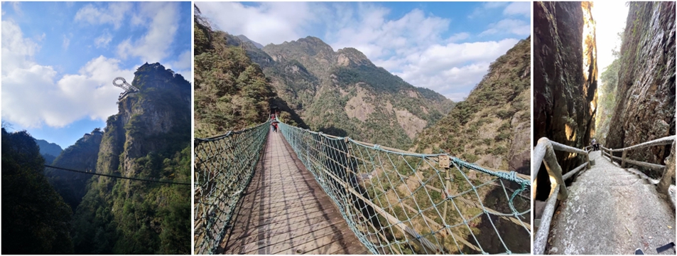 我们选了一条相对困难的登山路,同行的伙伴互相激励着前行,路过丁丁碑,踏过七夕桥,穿过生生门,一路走,一路看,一路赞,一路叹。前半部的登山路还算好走,一路上的各种情况都还在我的应对范围之内,就在我以为能这样顺利登顶的时候,金索桥给了我一个下马威。金索桥就在通往最高峰天师峰的必经之路之上,如果不想过只有原路返回,好不容易爬上来了怎么能轻易返回呢!金索桥说长不长,说短也不短,但是这高度着实让人胆寒。我在桥头纠结了半天,终于鼓起勇气踏上桥面。处于恐高的本能,我紧紧抓住了扶手缆绳,一眼都不敢向下看,一步步艰难的朝前挪去。索桥的轻微晃动,让我脑中一片空白,在双脚重新踏上对面山体的那一秒,我感觉双腿已经不受控制了,赶紧坐下来放松一下。稍微恢复了下体力,我们接着出发了。现在,摆在我们面前的是最后一个拦路虎--一线天!站在一线天前,抬头望去,山体像是被一把利剑从中间切开,一条天梯直通云霄。走上阶梯,才知道路的险峻,越往上爬,阶梯越陡,踏步也越小,似乎有只无形的手在把你往下拉,越来越用力,真是三步一歇,五步一靠,到最后只能紧紧拉着栏杆才能向上爬。好不容易到顶了,大家都累得满面通红,筋疲力尽,浑身汗如雨下。休息片刻,我们终于顺利登顶。山顶有座天师殿,殿前有亭,亭中悬挂有一座铜钟,抬起钟锤用力撞钟,只听得“当...当...当...”的钟声回荡在群山之中,每次回音都能穿透人的灵魂,净化人的心灵,顿时都感觉没那么累了。