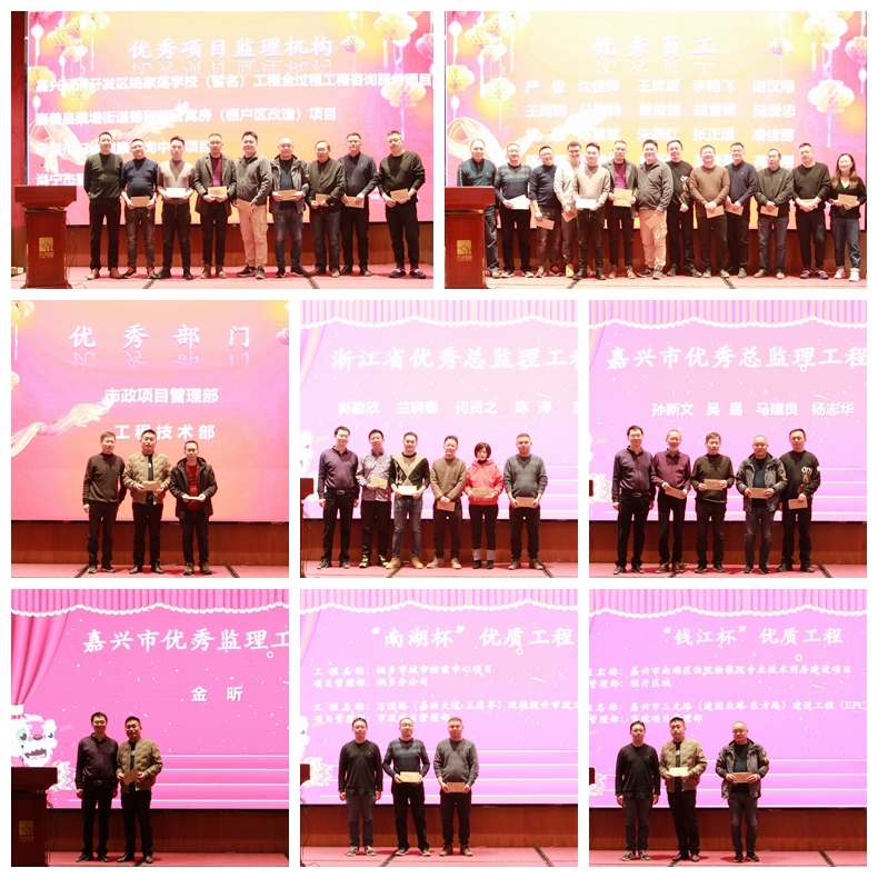 星光不负赶路人,公司所取得的成绩离不开广大员工的辛勤付出,这其中就涌现出了不少先进个人和团队,在本次总结表彰大会的表彰环节,公司领导分别向这些先进个人和团队颁发了优秀部门、优秀项目监理机构、优秀员工、浙江省优秀总监理工程师、嘉兴市优秀总监理工程师、嘉兴市优秀监理工程师、“钱江杯”“南湖杯”优质工程项目、通过国家注册监理工程师考试人员、标书提升建议奖等奖项,正是由于这些优秀的个人和团队的爱岗敬业、拼搏奋斗才有了快速路工程的顺利通车、一环四路改造等工程的完美呈现,这许许多多的工程不仅见证了嘉兴的蝶变跃升,同时也在经建的功勋墙上抹上了浓重的一笔。