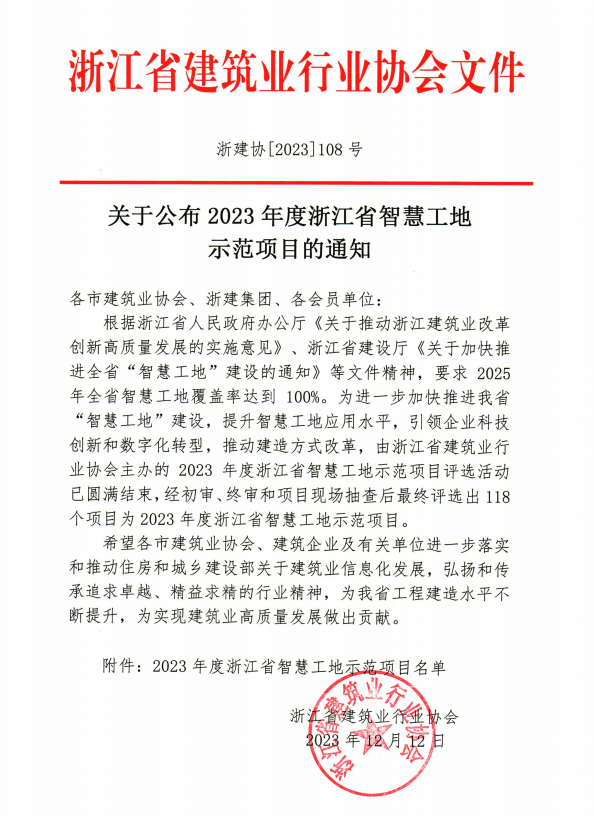 近日,浙江省建筑业行业协会发布《关于公布2023年度浙江省智慧工地示范项目的通知》,由我司监理的海盐县康体活动中心(全民健身中心)、桐乡市凤凰湖科技城研发社区中心项目一期(A区)、嘉兴国际金融广场二期5号地块工程三个项目获评2023年度浙江省智慧工地示范项目。