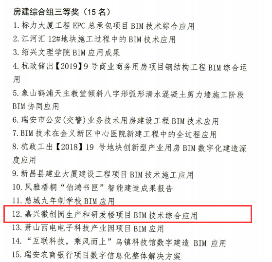 浙江省建筑业行业协会发布的《关于表彰2023年浙江省数字建造创新应用大赛获奖项目的通知》,由我司监理的嘉兴微创园生产和研发楼项目BIM技术综合应用获得房建综合组三等奖。