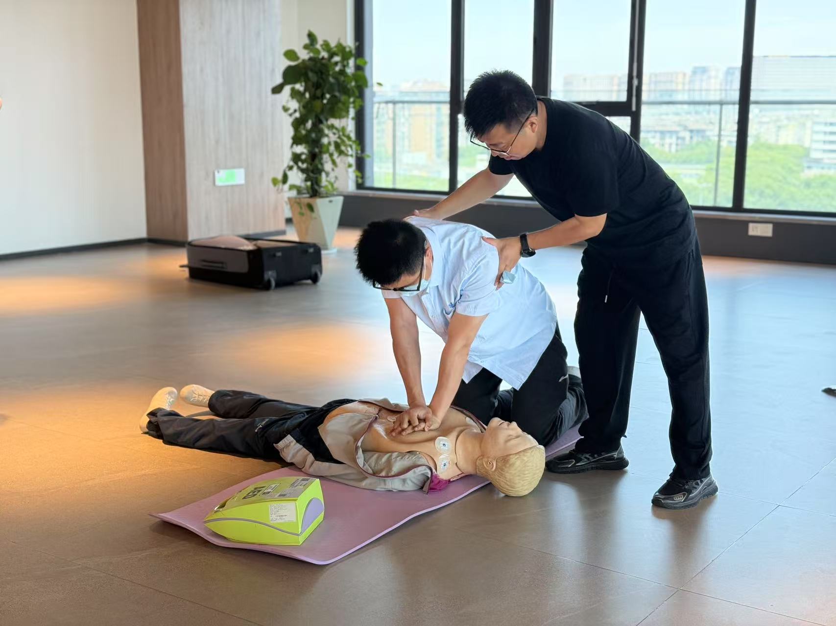 在心肺复苏术环节,陶主任详细阐述了心肺复苏的重要性、适用场景及操作步骤,并现场演示了正确的按压手法和呼吸技巧。员工们纷纷上前实践,在陶主任的指导下,逐步掌握了这一关键技能。此外,陶主任还介绍了AED的使用方法,强调了其在急救过程中的重要作用。